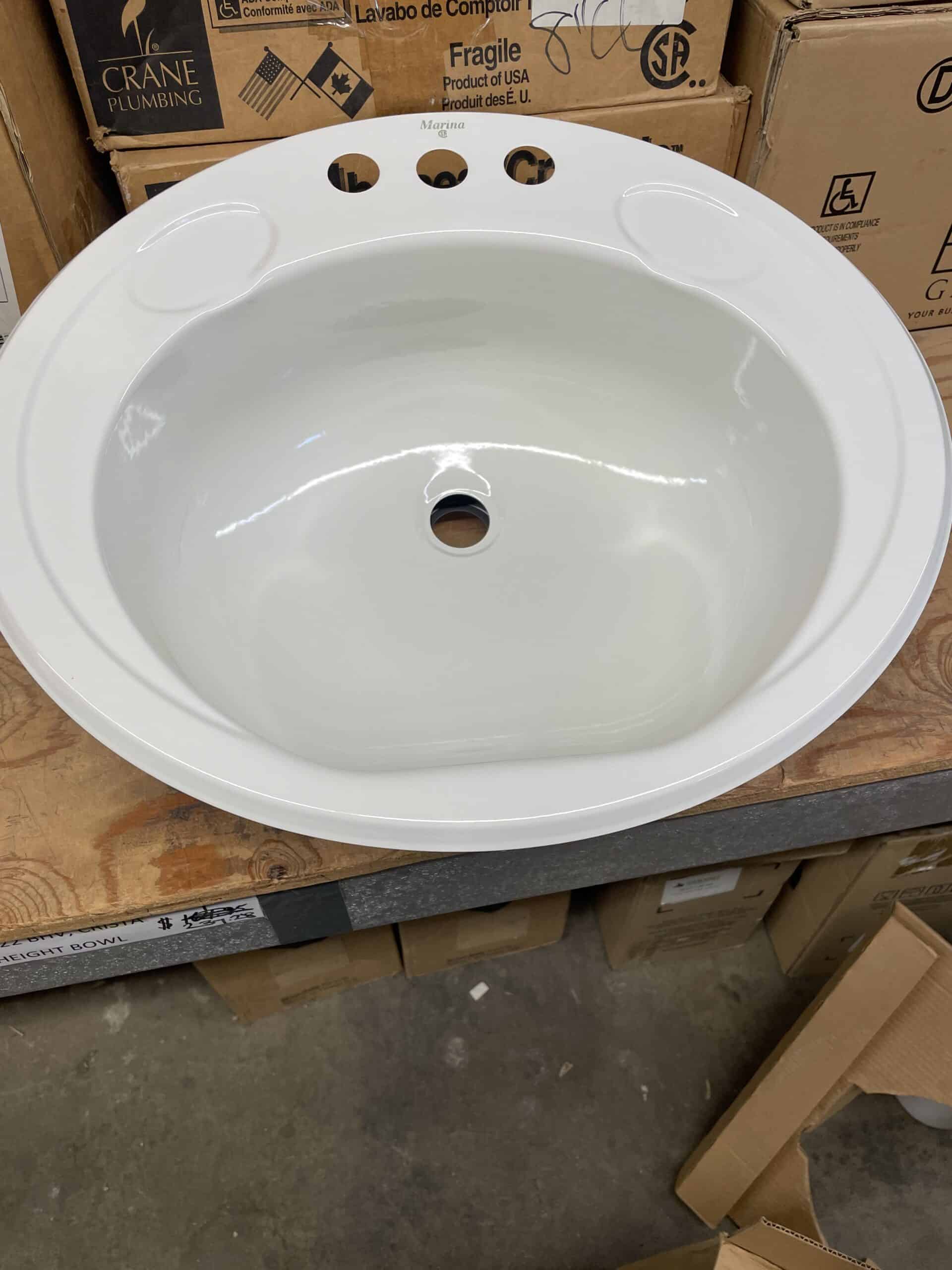 Brand new in box, only opened for photos. 20″ x 17″ 3 holes 4″ cc. Stainless steel with vinyl rim. Marina. mounting kit included.